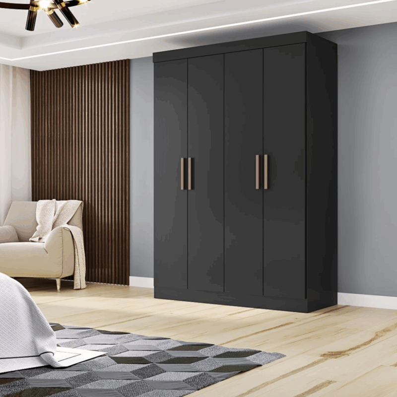 COMEDOR RUSTICO RECTANGULAR BASE LISA PATA REDONDA COLOR NEGRO+ 4 SILLAS TAPIZ GRIS FELPA