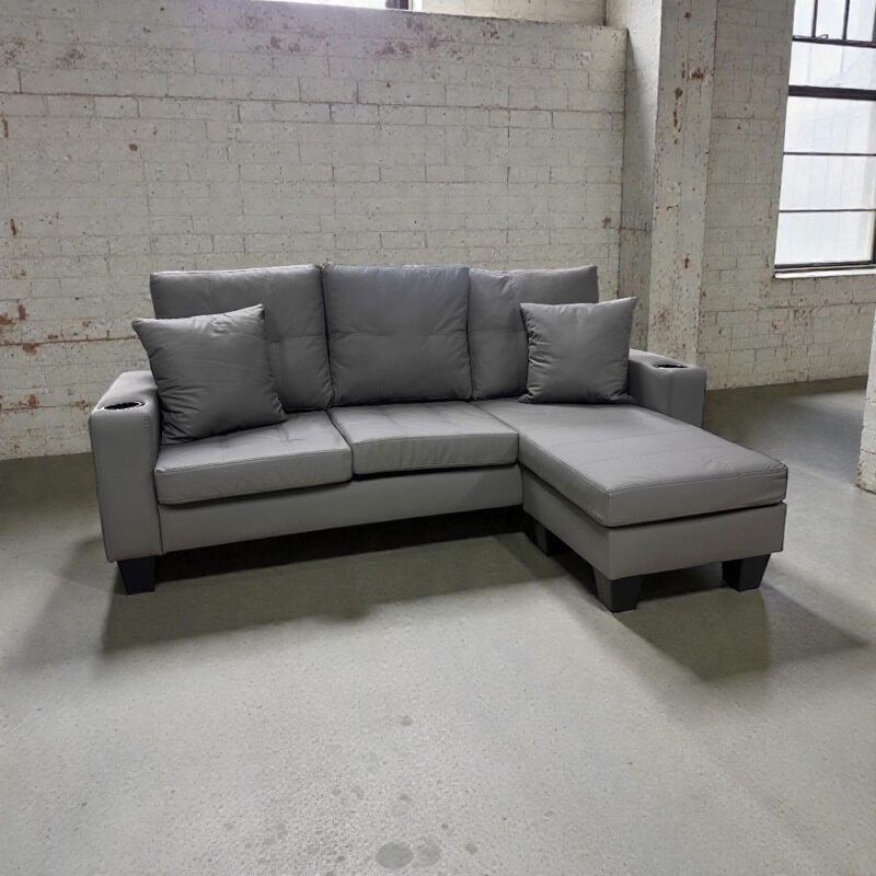 SECCIONAL BRAZO RECTO CON POSA VASO Y MODULAR COLOR GRIS DE CUERINA (LEOPAR)