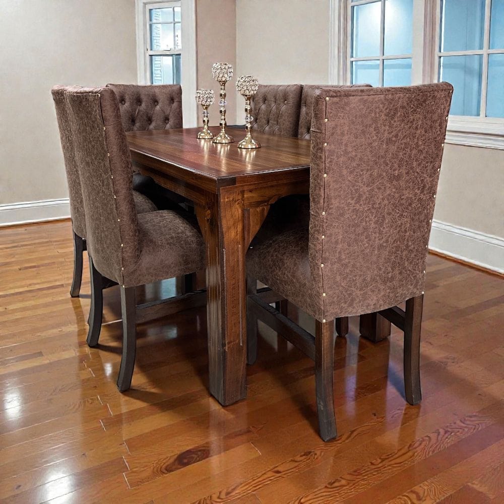 Sé el primero en valorar “COMEDOR RECTANGULAR BASE LISA PATA CUADRADA RANURADA COLOR CAOBA + 6 SILLAS CAPITONE CAFE MICRO CUERO”