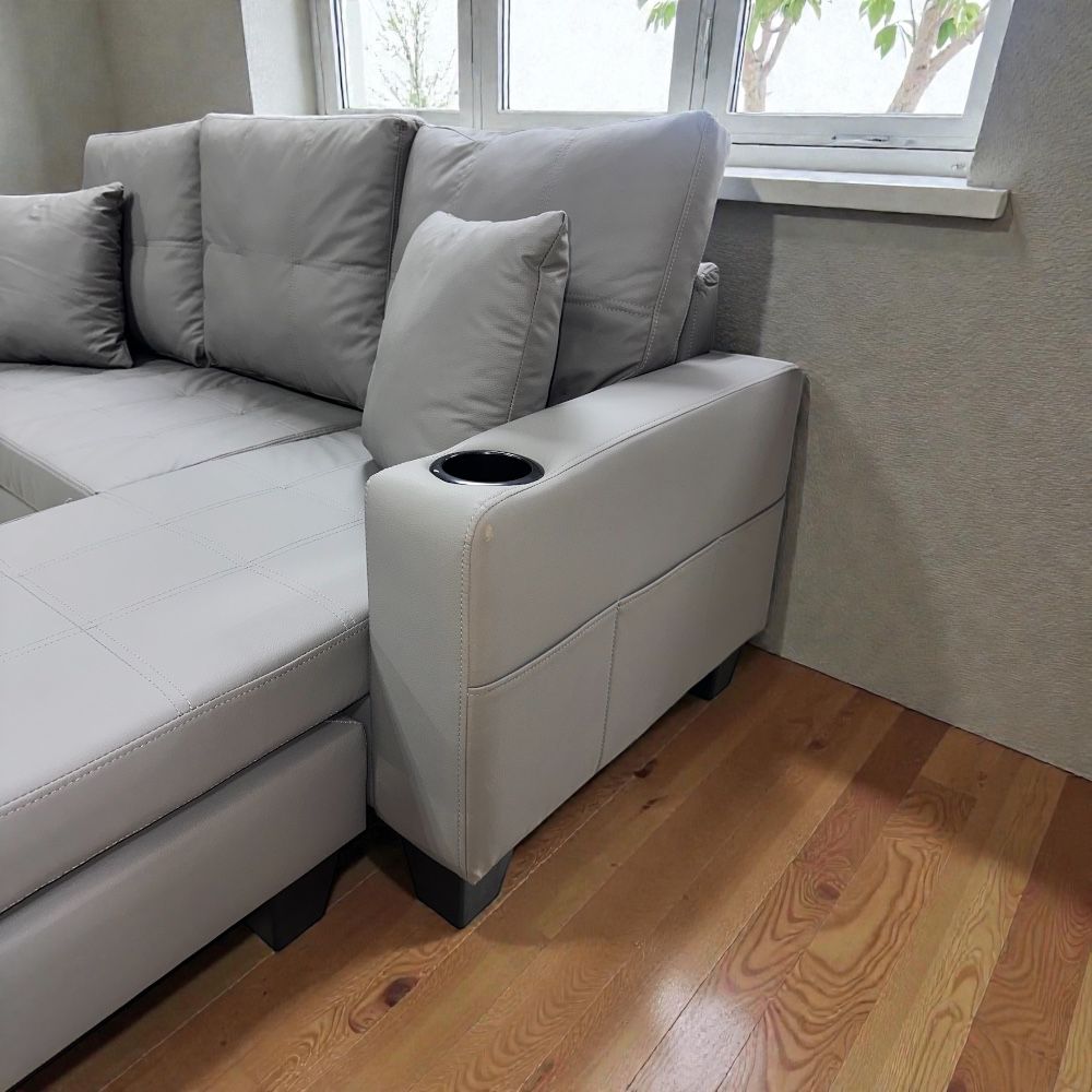 SECCIONAL BRAZO RECTO CON POSA VASO Y MODULAR COLOR GRIS DE CUERINA (LEOPAR)