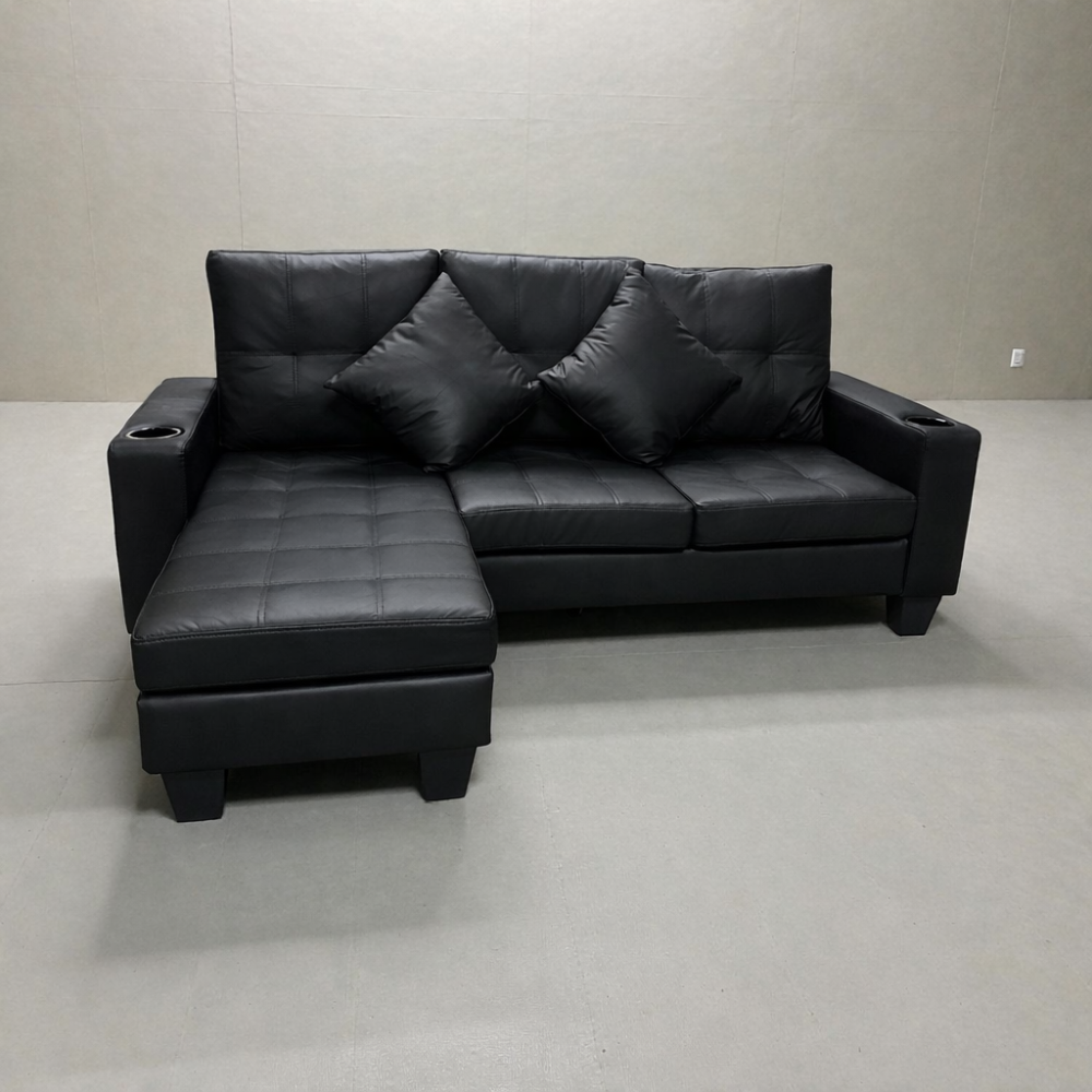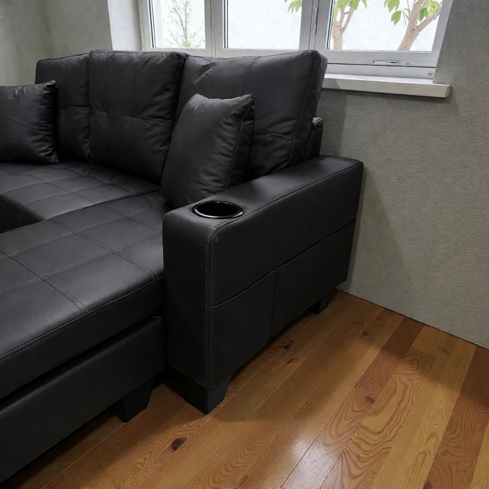 SECCIONAL BRAZO RECTO CON POSA VASO Y MODULAR COLOR NEGRO DE CUERINA (LEOPAR)